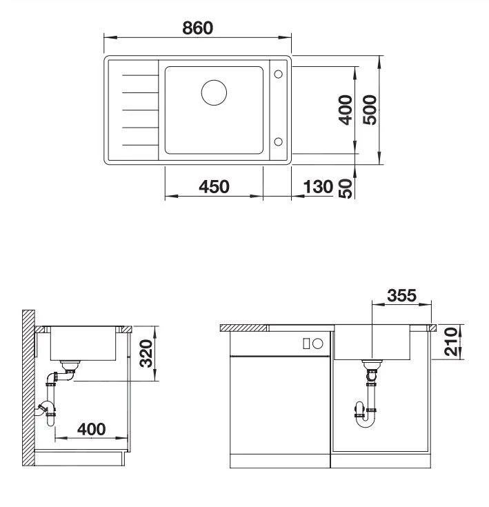 - Gesamtabmessungen: 860 x 500 x 210 mm (LxBxT)