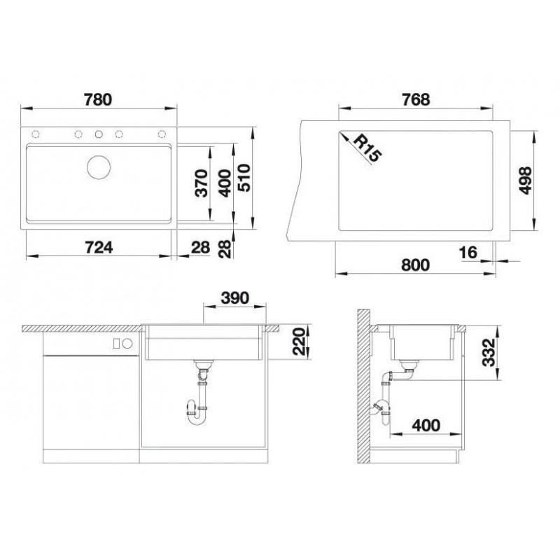 - Abmessungen des Spülbeckens 724 x 370 mm
