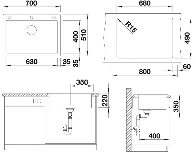 - Abmessungen des Spülbeckens 630 x 400 mm